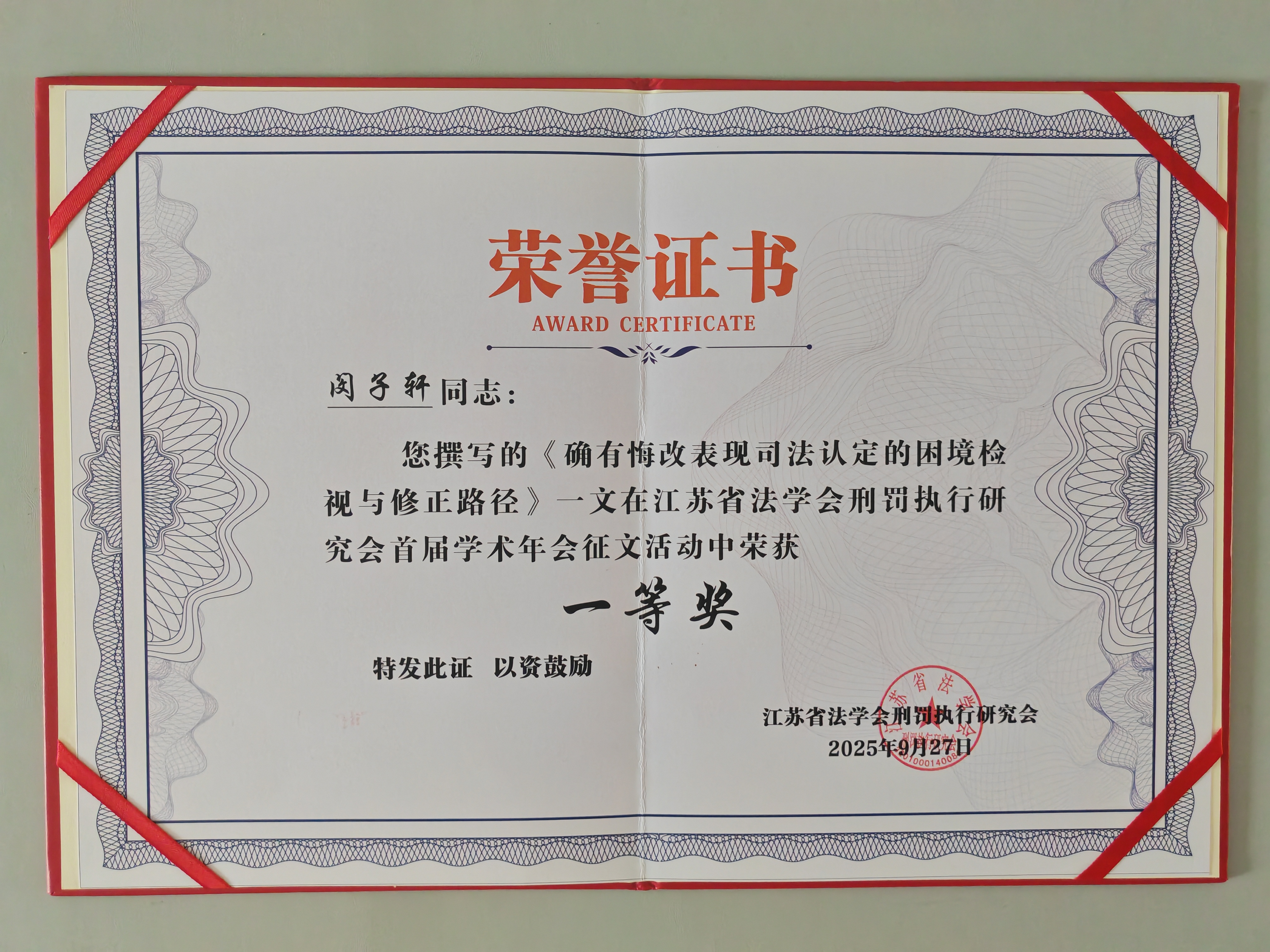 9月27日,江苏省法学会刑罚执行研究会在江苏司法警官职业学院举行成立大会暨首届学术年会。本次研究会聚焦“《中华人民共和国监狱法》修订视域下刑罚执行质效研究”,征集了全国各地交流文章434篇。经评审,共评选出一等奖论文5篇、二等奖论文10篇、三等奖论文15篇、优秀奖论文30篇。其中,由我院副检察长吴爱民、刑事执行检察部三级检察官闵子轩撰写的《确有悔改表现司法认定的困境检视与修正路径》一文获一等奖。