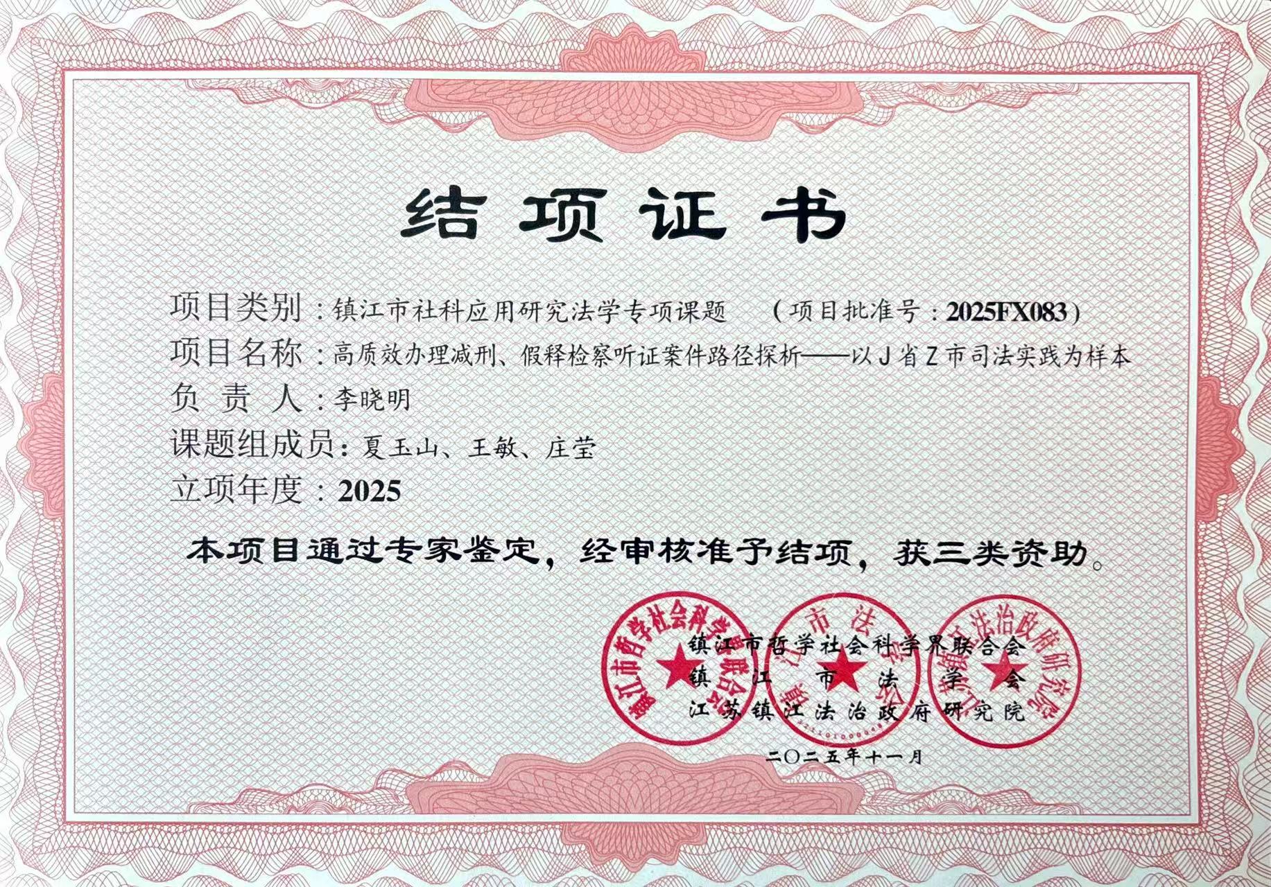 近日,我院申报立项的2025年镇江市社科应用研究法学专项课题《高质效办理减刑、假释检察听证案件路径探析——以J省Z市司法实践为样本》,经审核,顺利结项。